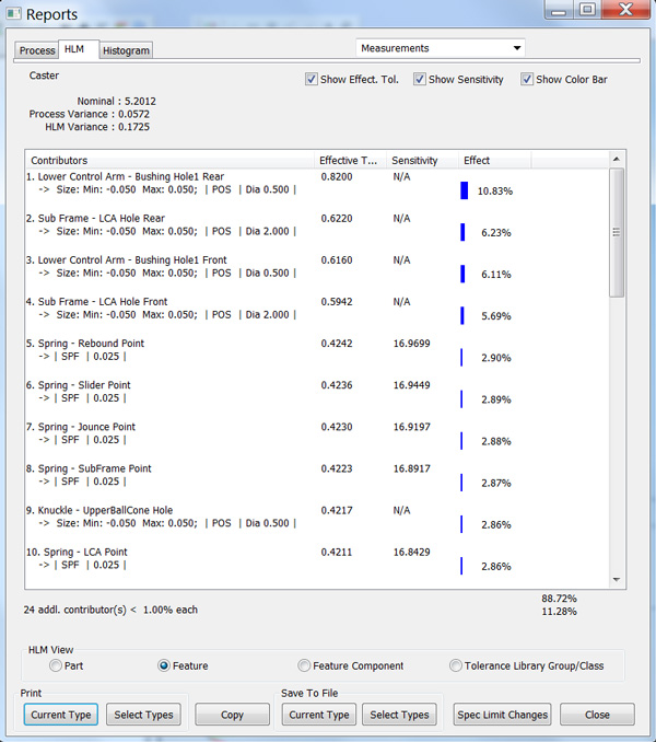 Observa-se que a tolerância que está no topo da relação é responsável por 10,83% da variação do caster. Esta informação é muito valiosa porque vai direto à raiz do problema dimensional e aponta a causa principal.